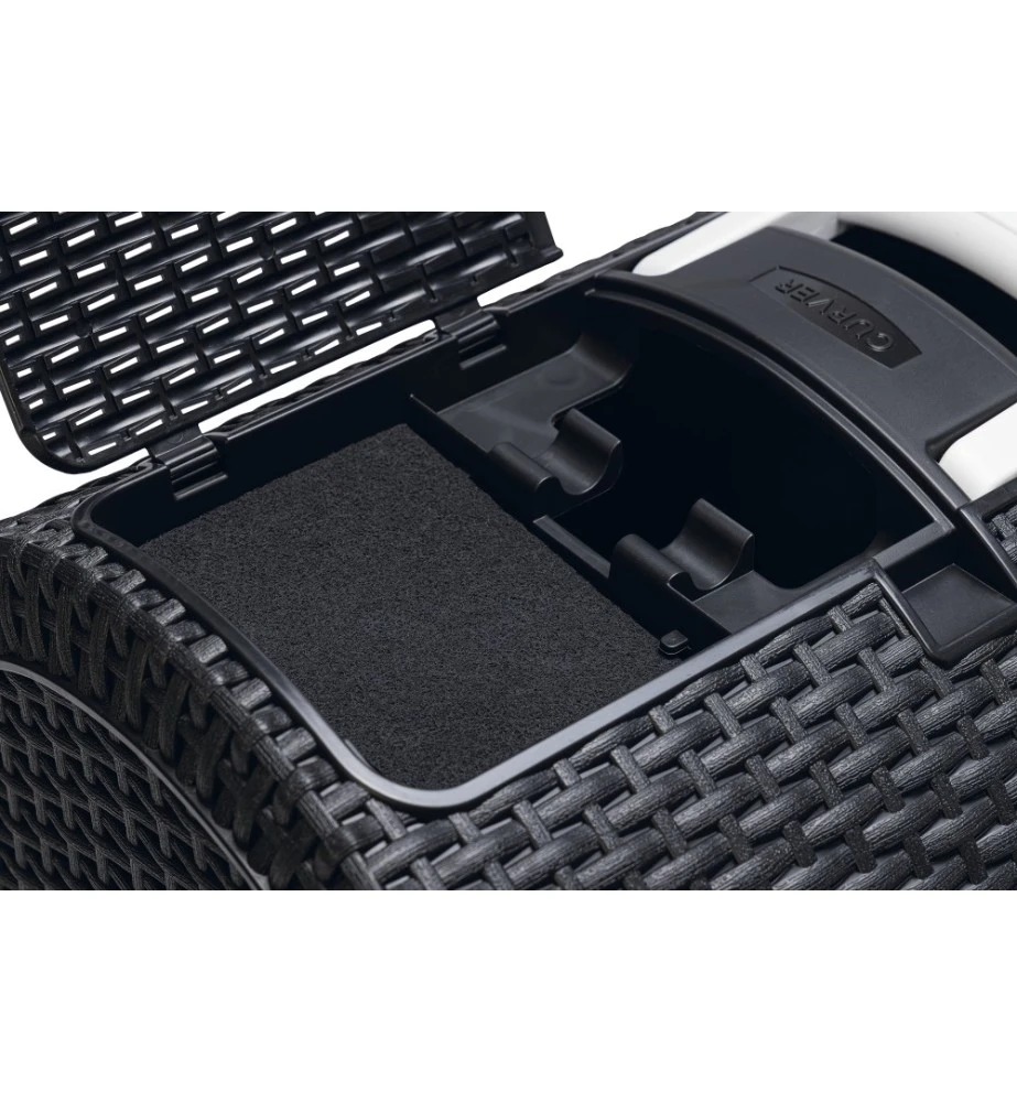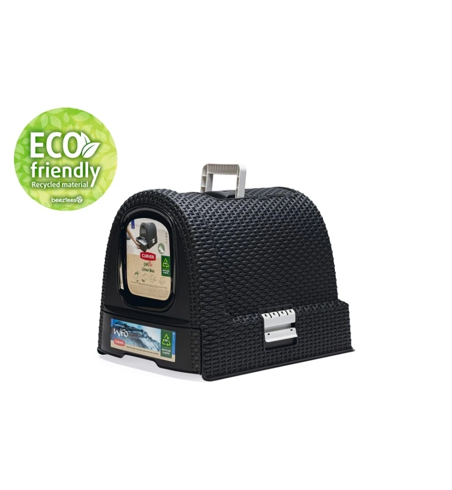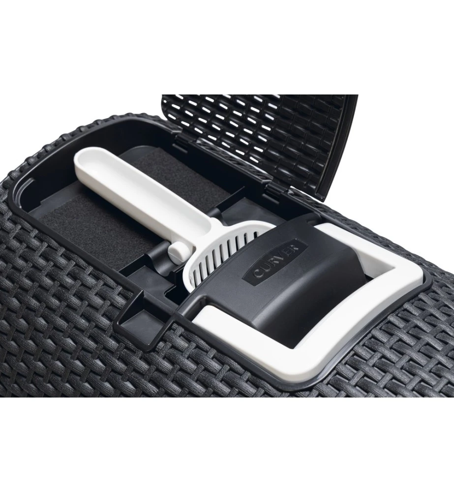 De Curver kattenbak heeft een modieuze uitstraling doordat het een motief heeft van gevlochten rattan. De lade aan de voorkant heeft een plateau met gaatjes, waardoor de kat een groot deel van het kattenbakgrit achterlaat in de bak alvorens de kattenbak te verlaten. Door de uitschuifbare lade kan je in een oogopslag zien of de kattenbak aan verschoning toe is. Aan de bovenkant van de kattenbak bevindt zich een klepje waar de kattenbakschep opgeborgen kan worden.