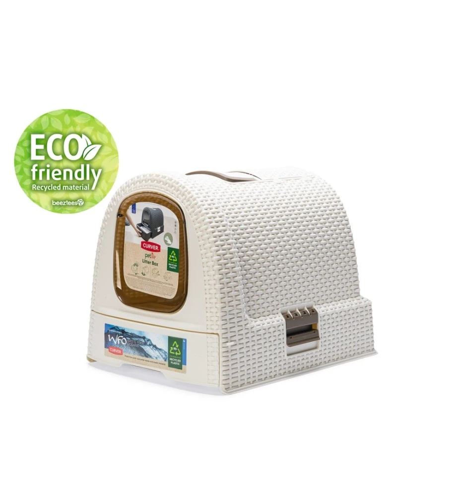De Curver Kattenbak bestaat voor 95% uit gerecycled materiaal (huishoudelijk plastic afval en oude visnetten op de bodem van de zee (ocean waste)). De hele kattenbak is op zijn beurt ook weer 100% recyclebaar.